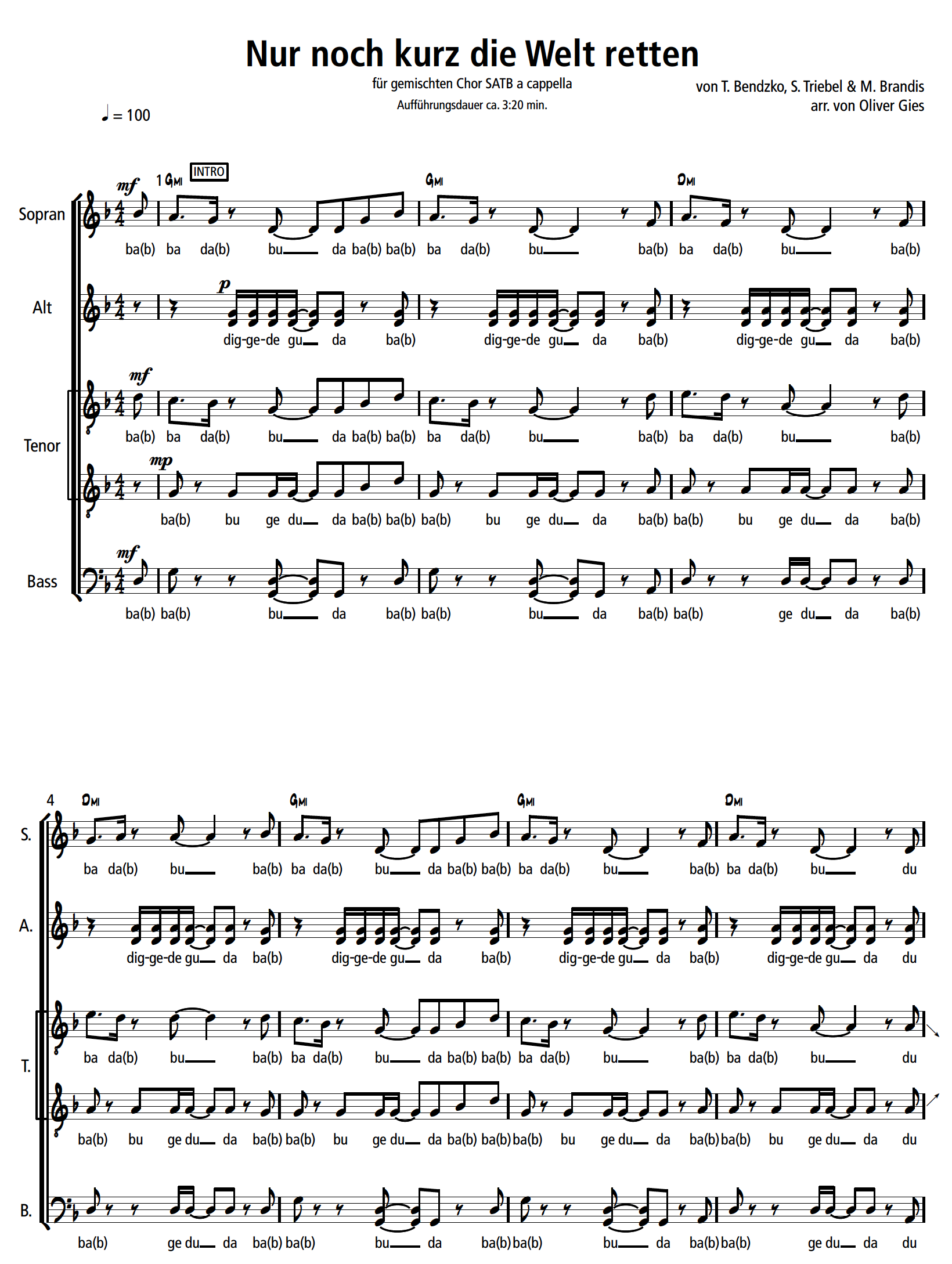 Oliver Gies schreibt: Mit dieser Nummer ist Tim Bendzko groß rausgekommen – und das zu Recht! Denn sie ist nicht nur originell und eingängig, sondern trifft auch noch voll unseren Smartphone-Zeitgeist, bei dem wir das Gefühl haben, es gäbe ständig was zu tun. Für meine Bearbeitung braucht man eine stabile Besetzung: Alle vier Stimmen sind im Laufe des Arrangements geteilt.