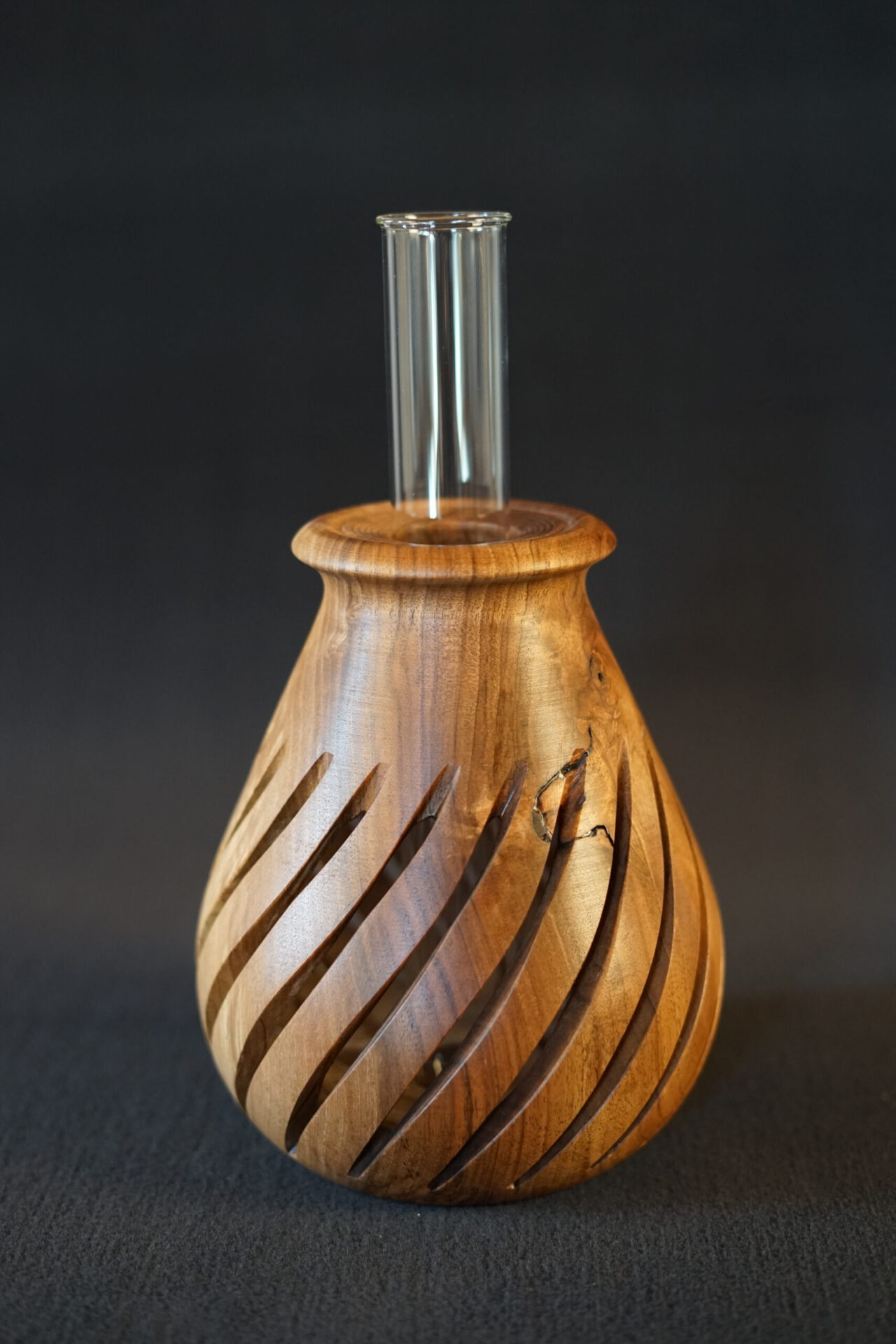 Diese Nussbaum Vase ist gedrechselt und danach kanneliert. Durch das Reagenzglas ist es möglich Blumen / Blumensträuße mit der Holzvase zu nutzen. Die Oberfläche wurde mit einem Hartwachs von Osmo veredelt.