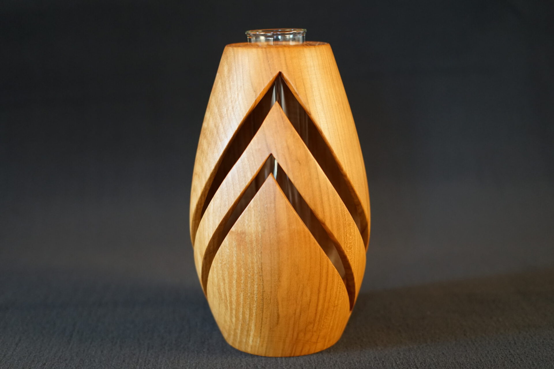 Gedrechselt, Vase aus Kirschbaum. Die Maße Höhe 28 Zentimeter Durchmesser Ø 16 Zentimeter. Kunstvoll Variiert. Für Blumen und Blumensträuße geeignet. Reagenzglas Höhe 28 Zentimeter Durchmesser Ø 16 Zentimeter
